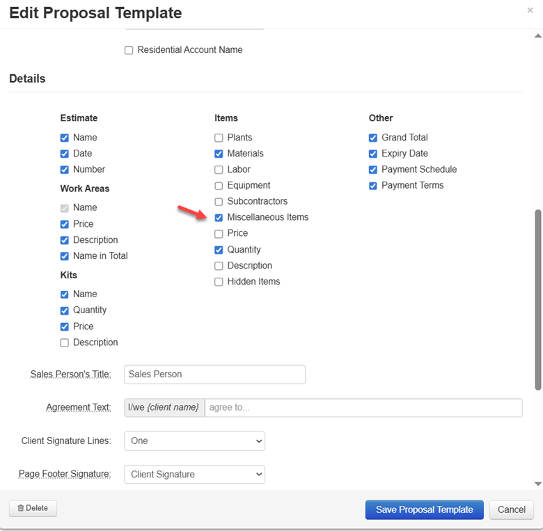Ensure that the proposal layout you are using is set up to show miscellaneous items. This will allow the discount misc item to be displayed on the proposal. If you have other misc items on the estimate that you do not want to be displayed on the proposal, you can either delete them from the Word document manually, or go to the costbook and mark those items as "hide on proposal". In Estimate > Actions > View Proposal > Select Proposal Template > Edit > scroll to Details > check Misc. Items > Save.