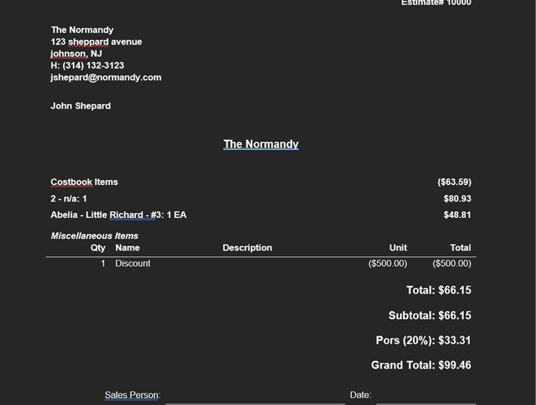 Once you generate the proposal, the Discount item will be displayed as a negative value using brackets, e.g. Discount (500).