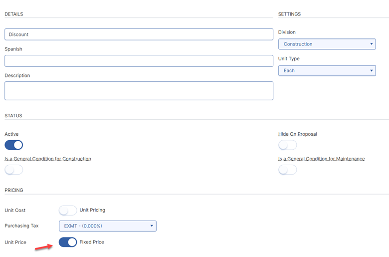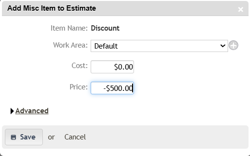 Create a new miscellaneous item called "Discount" in the Costbook. You can set it up however you want but we would advise marking it non-taxable and unchecking "unit pricing". The boxes for cost/price will disappear once you deselect "unit pricing". The amount of the discount will be entered once you add the item to an estimate. Be sure to select "fixed price" otherwise Manage360 will auto-calculate the price from the cost.