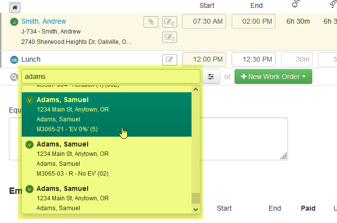 When searching on the Timesheet page, the results are displayed in a drop-down list. The top 25 results will be displayed (with a scrollbar if necessary).