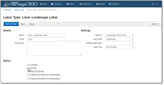 1. Click on the Labor Type you wish to archive to open the edit screen.