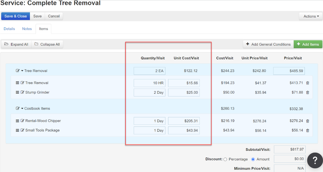 Next, we will find that service in our Costbook ( Costbook - >Services ) and change the quantity to 2. In real applications, this can range from a number of different changes but for this example, we will simply change the Quantity per visit to instead of 1 for Tree Removal. Notice the changes reflected.