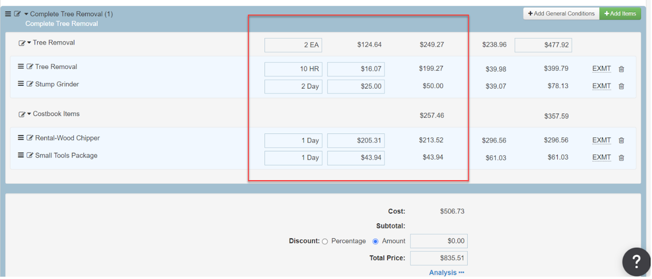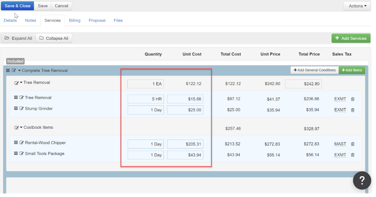 In the screenshot to the left 👈, we have an estimate where the template has a service already called Complete Tree Removal. Make note of the Quantity and Unit Cost as highlighted.