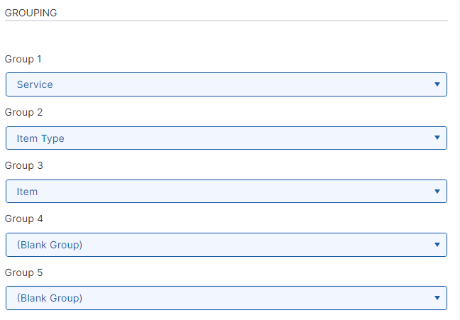 When determining totals, they can be grouped in different ways. The grouping options provide totals for each grouping level, and this report can have up to five levels (not all are required).