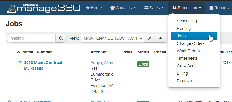 When dealing with maintenance estimates, we were able to browse our list of existing estimates under the Sales > Maintenance Estimates menu. Jobs are instead found under the Production > Jobs menu. The jobs menu contains all 3 job types: maintenance jobs, construction jobs, and non-contract jobs. If you would like to narrow down the list of jobs, you can use the search bar to search for a specific job, or use Views to create views which narrow down the list with criteria such as only open maintenance jobs, all closed jobs, only jobs associated with a specific crew or supervisor, etc.