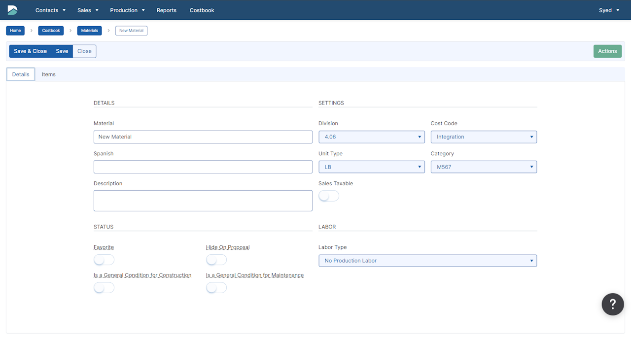 Click the Save and Close button to save the Material to the Costbook or Cancel if you would like to discard the entry.