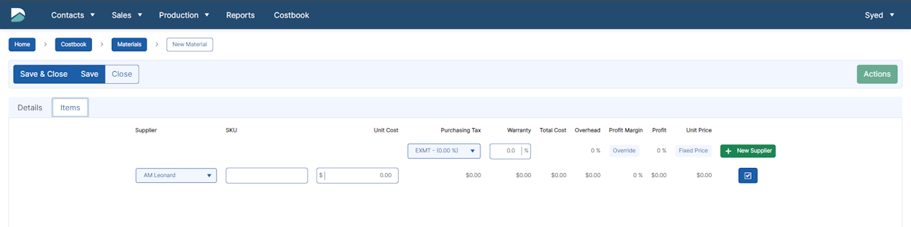 Click the Save and Close button to save the Material to the Costbook or Cancel if you would like to discard the entry.