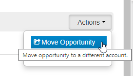 This process is initiated from the Opportunity to be moved and can be found by clicking the Actions button and selecting ‘Move Opportunity’.