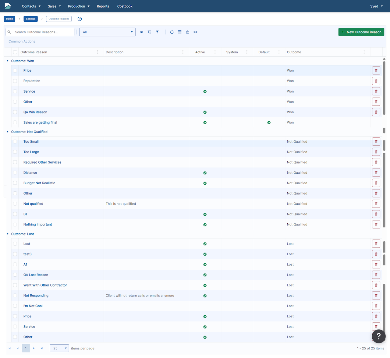 There are 3 outcomes that are tracked within Manage360 - Won, Lost, Not Qualified. These outcomes cannot be changed. The reasons can be attached to a specific outcome so that only certain reasons will appear for each outcome.