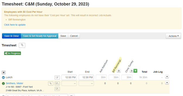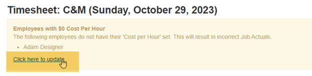 When a Timesheet is created, Manage360 will generate a warning if any of the employees assigned to the Timesheet have a wage of $0. This is important because the employee wage is used when calculating the value of the actual labor cost on any jobs on the Timesheet.
