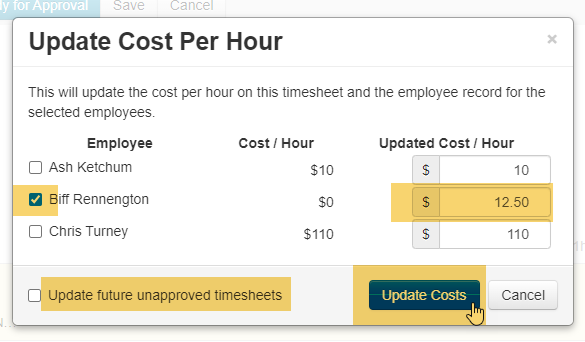 Click the checkbox on the left side beside the name of the employee to be updated (the Update Costs button will be available until at least one employee is selected).